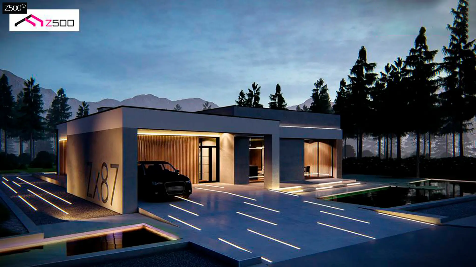 - Zx87135 m²Современный одноэтажный дом с навесом для автомобиля