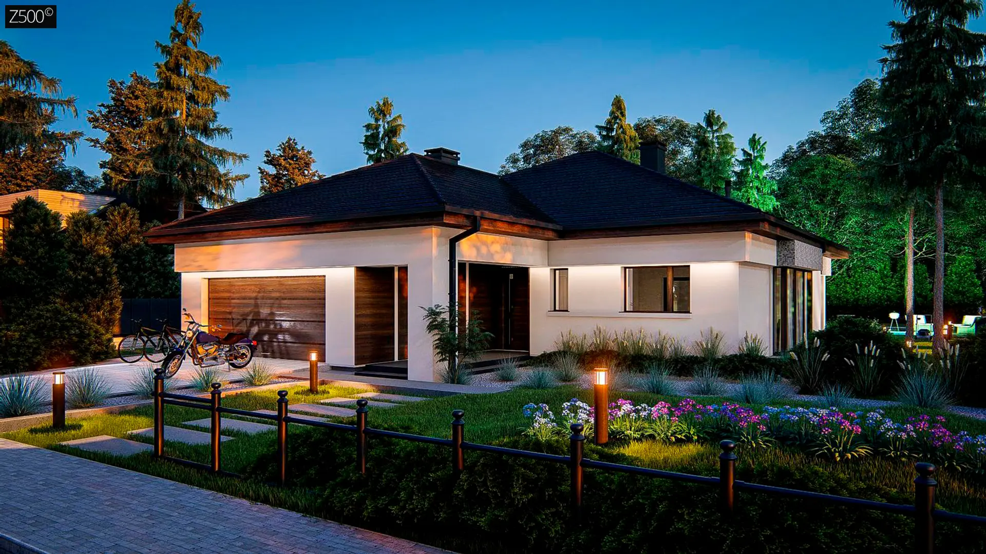 - Z200167 m²Удобный одноэтажный дом с гаражом для двух автомобилей, с большой площадью остекления в дневной зоне.